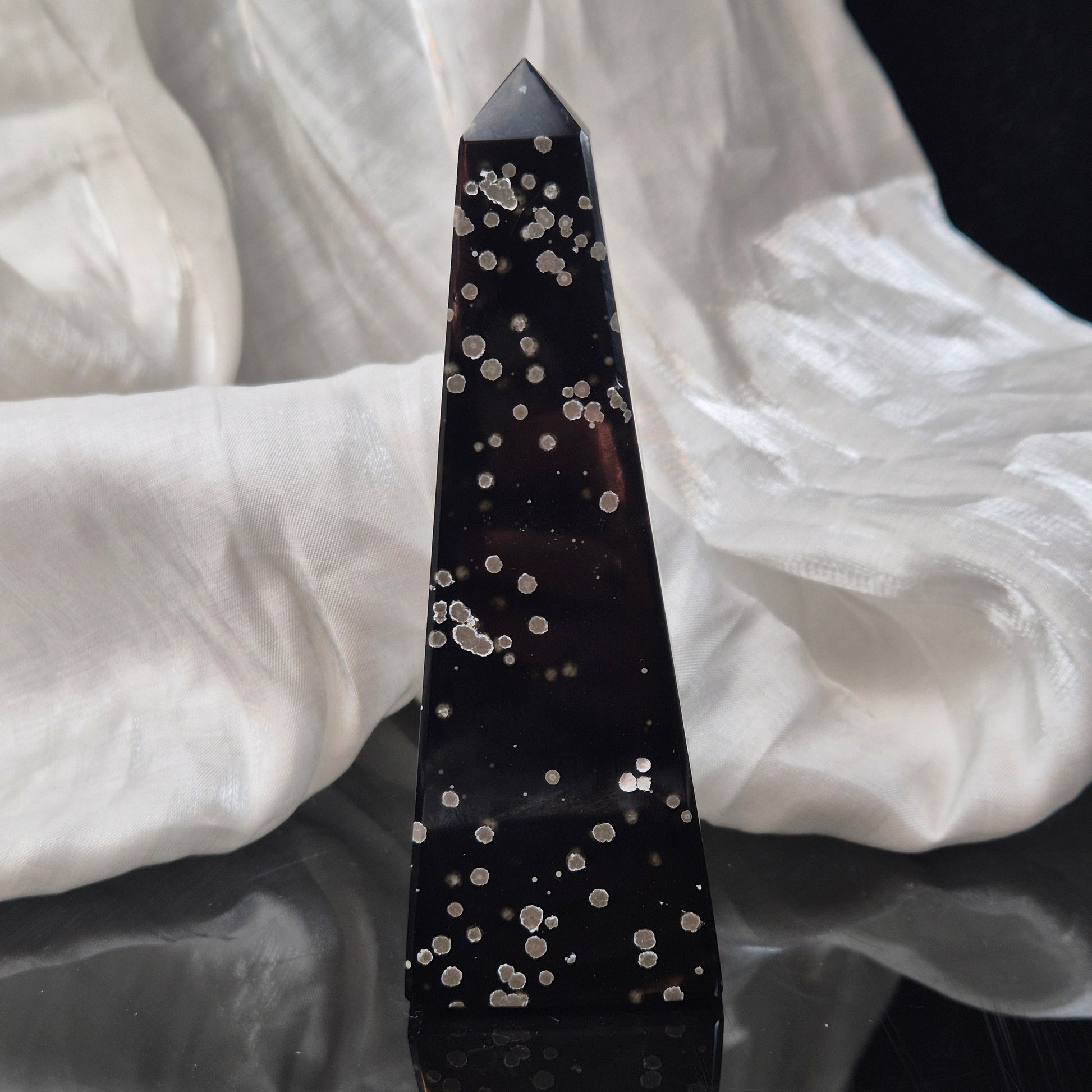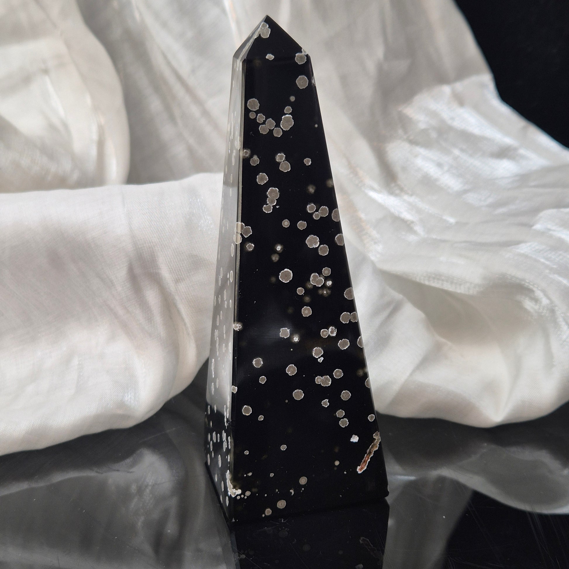 She is formed (like all obsidian) due to fast cooling lava. what makes her special are the white spots in layers🖤